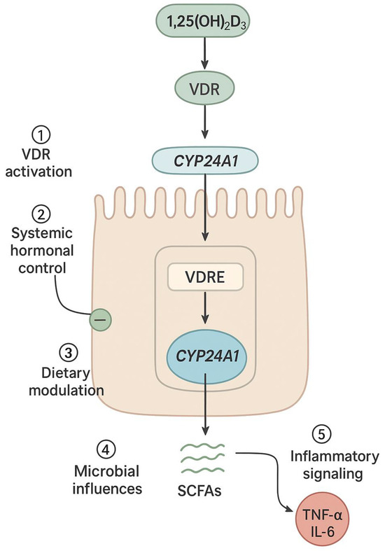 Microbial-derived metabolites and inflammatory signaling form a tightly connected axis that critically modulates intestinal CYP24A1 expression. Under healthy conditions, microbial communities support intestinal homeostasis through the production of metabolites such as SCFAs, which contribute to epigenetic regulation of vitamin D pathway genes [13,14,54,55]. However, in diseases like inflammatory bowel disease (IBD), dysbiosis leads to elevated lipopolysaccharide (LPS) levels and increased cytokine production, disrupting the expression of key vitamin D hydroxylases, including CYP27B1 and CYP24A1. Inflammation not only reduces substrate availability by suppressing CYP27B1 but also downregulates VDR expression, compromising feedback regulation of CYP24A1 [2,10,16,51]. This suppression is exacerbated by diminished production of VDR-induced antimicrobial peptides, particularly in Crohn’s disease. Additionally, environmental factors such as calcium intake, micronutrient status, and hydration may influence microbial activity and, consequently, CYP24A1 expression [17,56]. Mouse models further illustrate the significance of this axis: VDR-deficient mice demonstrate heightened susceptibility to colitis and increased expression of inflammatory mediators like IFN-γ and IL-17, along with dysregulated CYP24A1. Some pathogenic bacteria can even bind or degrade VDR, directly interfering with its transcriptional activity. The resulting loss of regulatory balance forms a vicious cycle of inflammation, VDR suppression, and CYP24A1 upregulation. These insights suggest that therapeutic strategies aimed at modulating the microbiota or enhancing VDR activity could help normalize CYP24A1 expression and restore intestinal equilibrium [5,12,13,57,58,59,60].
