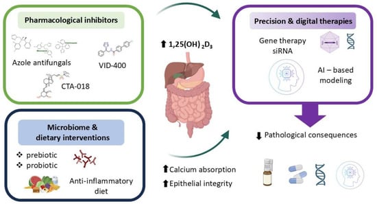 Together, these innovative strategies reflect a shift toward personalized, mechanism-based interventions. By aligning molecular targeting of CYP24A1 with patient-specific factors, future therapies may more effectively restore intestinal vitamin D activity, support epithelial integrity, and improve systemic mineral homeostasis (Figure 5).