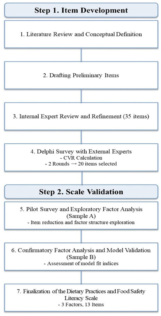 As a preliminary step toward developing the Dietary Practices and Food Safety Literacy Scale, a comprehensive literature review was conducted to establish the theoretical definitions of relevant concepts. “Dietary practices” was conceptualized as an inclusive process encompassing the production, selection, preparation, consumption, and disposal of food, as derived from the analysis of lifecycle-specific dietary guidelines provided by organizations such as the Dietary Education Support Center and the Ministry of Food and Drug Safety in Korea, as well as a study by Kim [23]. Another key concept, “hygiene and food safety,” was defined in accordance with the World Health Organization (WHO) as encompassing all measures necessary to ensure the safety and integrity of food throughout the entire process, from cultivation and production to manufacturing and final consumption [24].