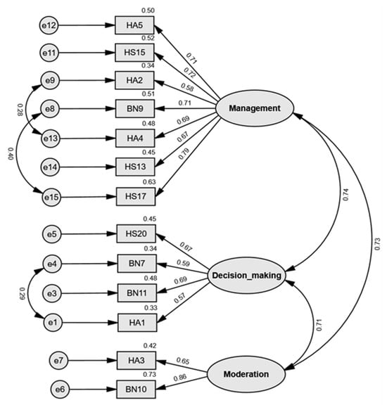 The main study was conducted to confirm the factor structure identified in the EFA. CFA was performed to assess the extent to which the relationships between the subfactors and their corresponding observed variables, as specified through EFA, accurately reflected the response patterns of the study participants. Considering potential issues related to item loss and factor interpretability, the three-factor structure was identified as the most stable and theoretically coherent solution. Although two- and four-factor models were also examined, they showed poorer model fit and required the elimination of several key items, which undermined conceptual validity and structural consistency. In contrast, the three-factor model demonstrated satisfactory statistical fit and theoretical coherence and was therefore adopted as the final model, comprising management, decision-making, and moderation competencies. A detailed examination of the model was performed. In addition, modification indices (MI) were examined to improve model fit. High MI values were identified between certain error terms within the same subfactor—particularly between items e1 and e4, e8 and e15, and e9 and e13. Based on theoretical rationale and content similarity, covariance paths were added between these error terms. Following these modifications, the model fit improved [40].