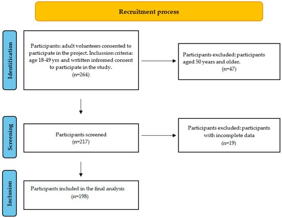 Participants were instructed to arrive at the center between 07:30 and 09:00 after at least 12 h of overnight fasting and rest. The study protocol comprised a comprehensive assessment, including questionnaire-based interviews, anthropometric and blood pressure measurements, endothelial function evaluation, and blood sample collection. All the participants completed the questionnaire covering sociodemographic characteristics, smoking status, dietary patterns, physical activity levels, and medical history. The survey was constructed using measures applied in our prior studies [,].