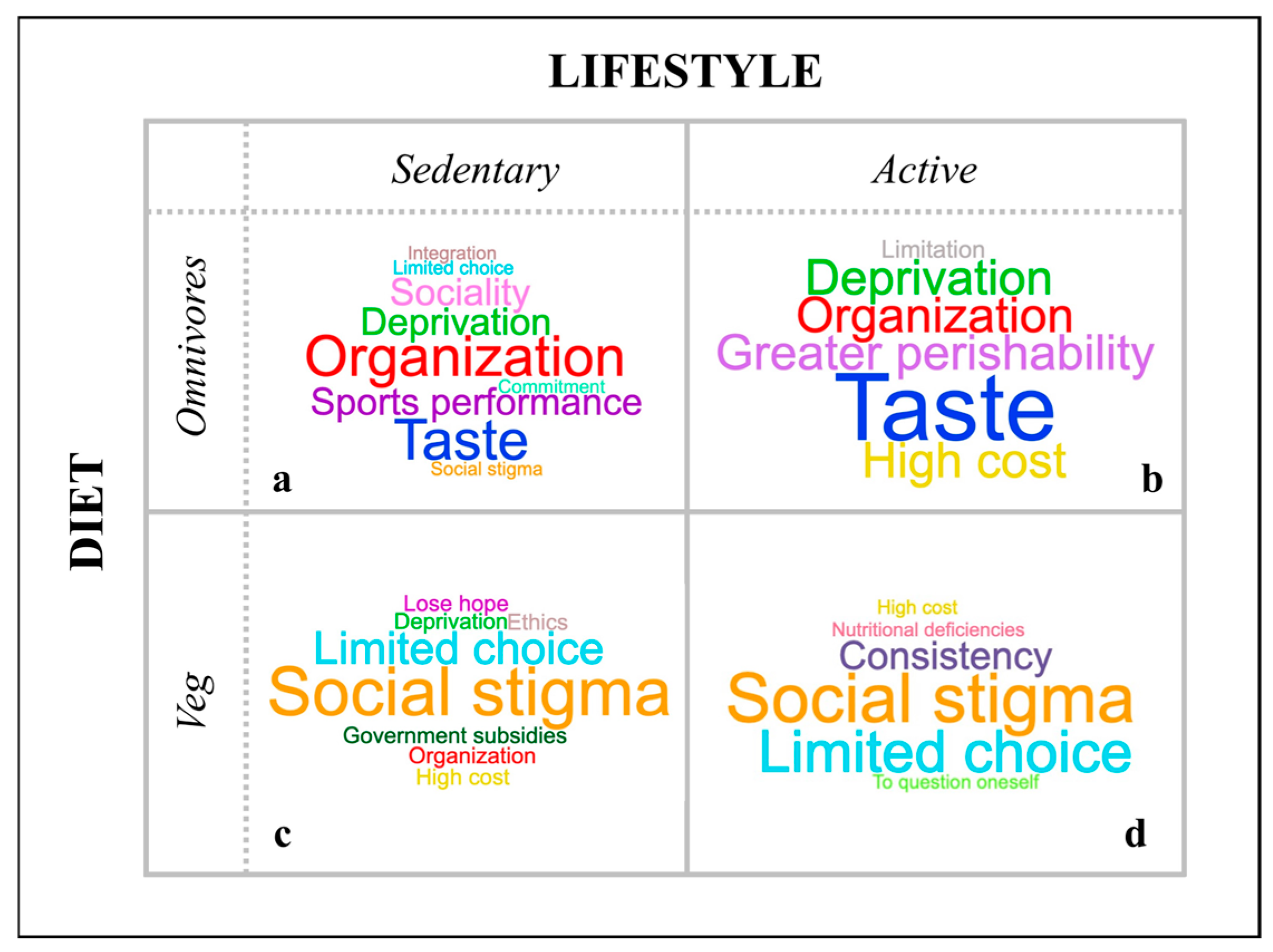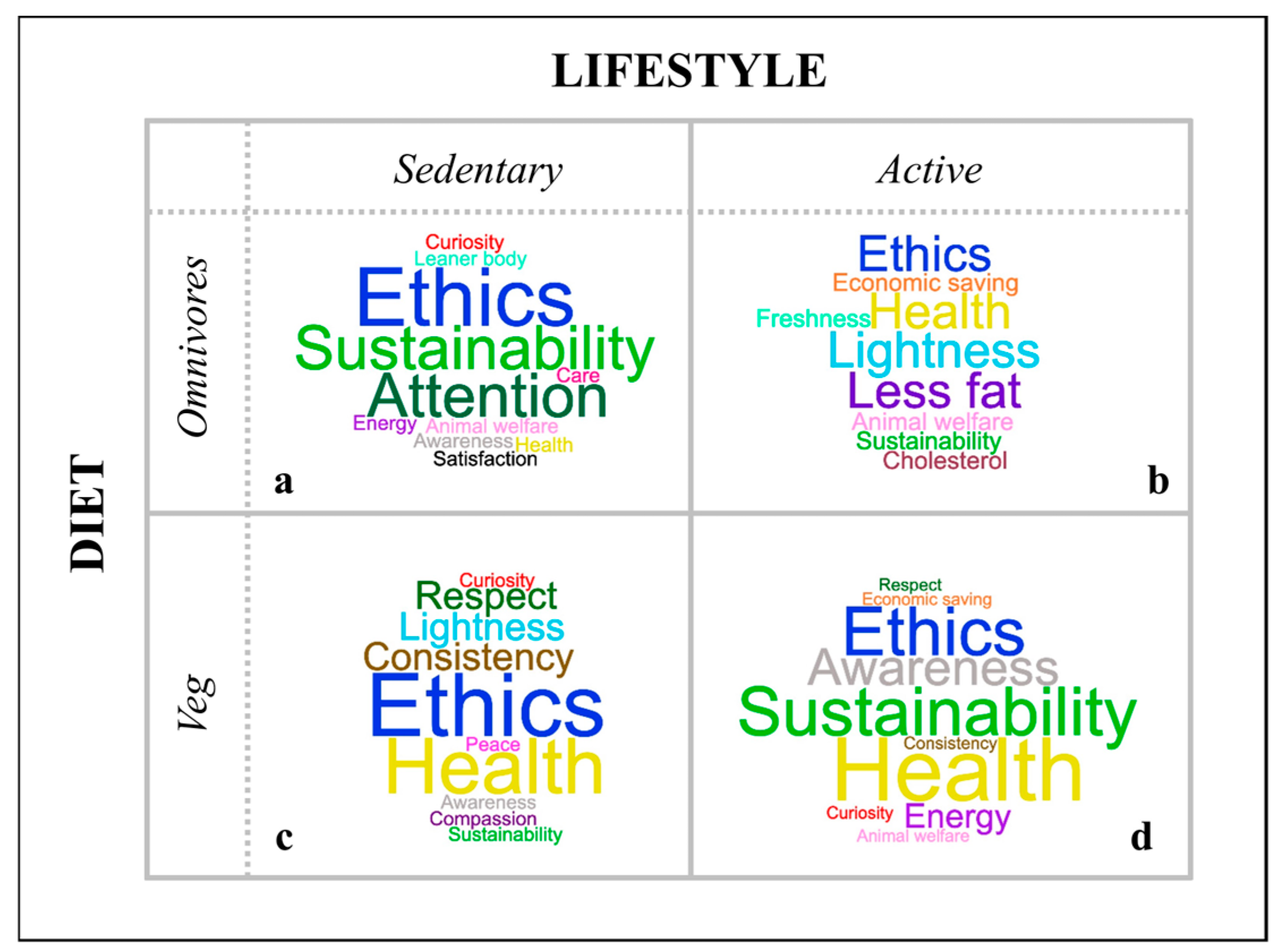 3.3. Research Question II: What Are the Promoters of the Plant-Based Choice? How Do They Vary by Lifestyle?