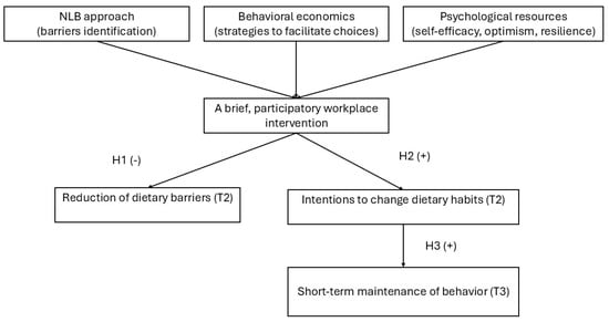 The Brief Participatory Behavioral and Educational Workplace Intervention (BPBEWI) is an intervention designed to promote healthy eating in the workplace by reducing perceived dietary barriers and strengthening readiness to change dietary behaviors. The NLB approach (needs-based, learner-centered, behaviorally focused; []) was applied to identify employees’ dietary barriers prior to the intervention. The intervention incorporated behavioral economics strategies [,,,] aimed at facilitating healthier choices in the everyday work environment. Additionally, activities were designed to strengthen key psychological resources—self-efficacy, optimism, and resilience—that are known to positively influence the maintenance of health-promoting behaviors [,,,,]. Table 1 presents the logic model outlining the relationship between inputs, mechanisms, and expected outcomes.