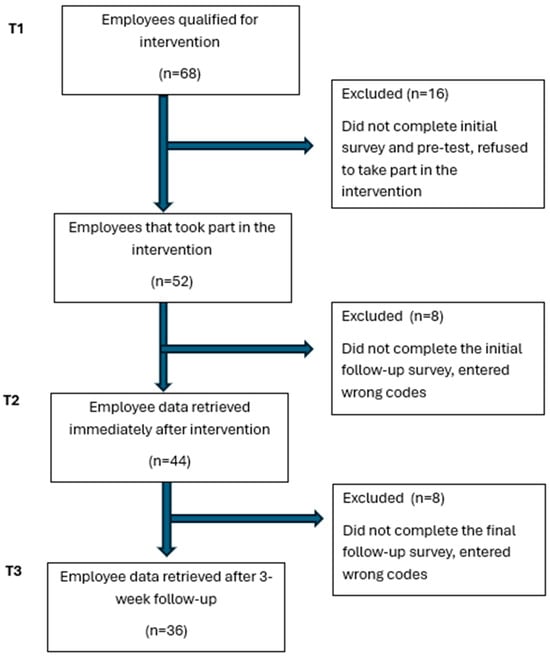Of the 68 eligible employees invited to participate, 52 provided written informed consent and completed the baseline assessment (participation rate: 76.5%). At post-intervention assessment (T2), 45 participants submitted questionnaires, and 36 completed all three assessment points, resulting in a final retention rate of 69.2%. No withdrawals were related to dissatisfaction with the intervention.