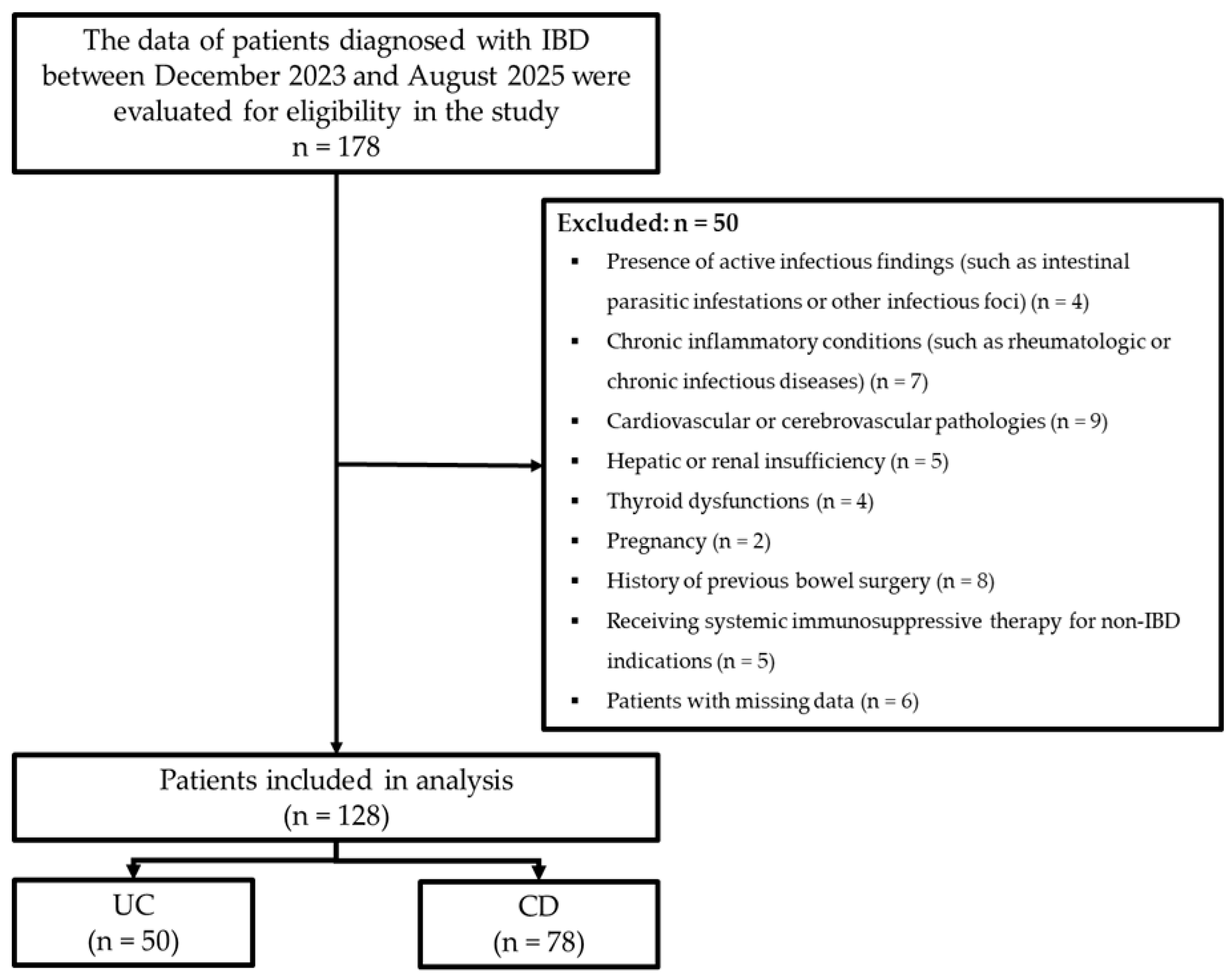 - Sherif, M.; Fouad, R.; Elbaz, T.; Awadalla, M.; Tantawi, O.; Negm, M.; El-kareem, D.A.; Naguib, I.; Shehab, H.; Badary, H.A. Sarcopenia and low prognostic nutritional index as markers of disease activity in patients with inflammatory bowel disease and predictors of poor outcome: A cohort longitudinal study. Egypt. Rheumatol. Rehabil. 2024, 51, 55. [Google Scholar] [CrossRef]