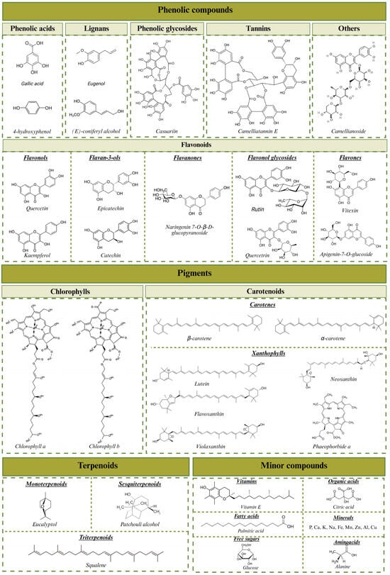CJL has great potential in the food industry due to its richness in bioactive compounds, such as carotenoids, polyphenols, flavonoids, saponins, and amino acids (Figure 2). Therefore, this matrix is being investigated for the development of various food products, primarily beverages and dietary supplements. Among these is the development of tea-like infusions like the ones produced from the leaves of C. sinensis. These infusions have the commercial appeal of being rich in antioxidant compounds and promoting metabolic health, making them a healthy alternative herbal infusion [,]. Various CJL products are already on the market. For example, in recent years, the Areeiro Phytopathological Station (Pontevedra, Spain) developed a tea from CJL marketed under the name “Areeiro Tea”, which opens the door to experimenting with the use of CJL in functional beverages.