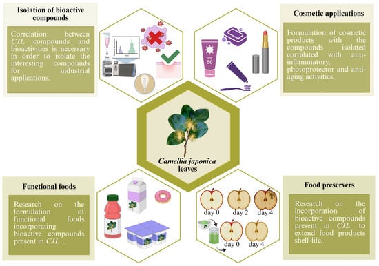 Despite the ornamental use of CJ, CJL has been shown to be a source of diverse bioactive compounds, including a wide variety of carotenoids, phenolic compounds, terpenoids, and other minor compounds. Furthermore, scientific evidence demonstrates that extracts obtained from CJL exhibit diverse bioactivities, with most available studies focusing on their antioxidant, antimicrobial, and anticancer properties. These multiple bioactivities justify the growing industrial interest in this matrix, with new research directed toward the development of new food products, additives, cosmetics, and pharmaceuticals. In addition, the growing global demand for healthier foods with fewer artificial additives reflects an increasing consumer preference for natural and functional ingredients. This trend presents significant market opportunities for products derived from such sources. As a result, establishing camellia plantations is becoming a key strategy to support the industrialization process, ensuring a sustainable supply of raw materials. Earlier laboratory-scale investigations have given a green light to this initiative and have assured its potentiality also in terms of satisfying production as well as market demands. Future research should prioritize the development of standardized methodologies and targeted investigations to ensure the reproducibility and high quality of extracts, thereby facilitating the industrial application of CJL.