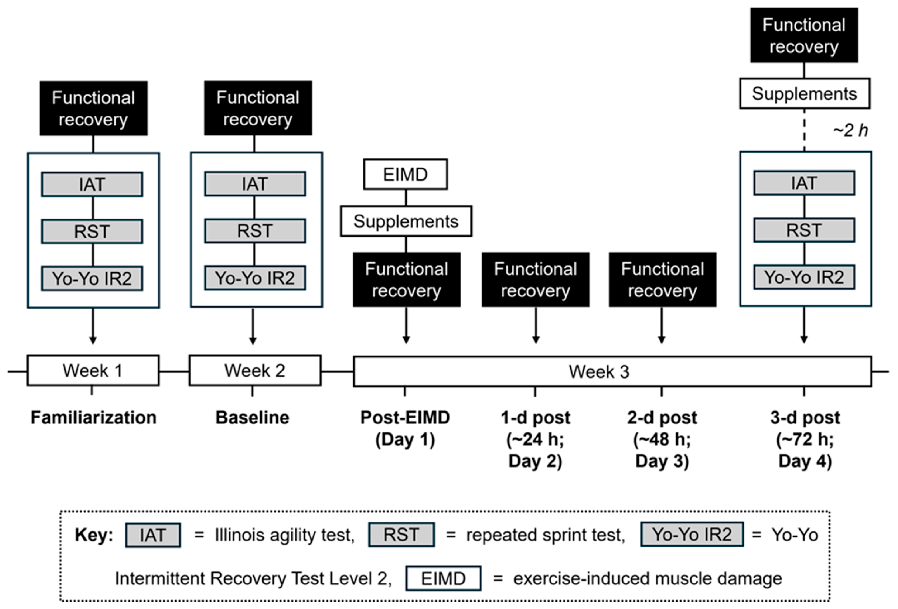 During familiarization, physical characteristics (stature, body mass) were recorded using an ultrasonic measuring station (SECA, Hamburg, Germany). Thereafter, participants were familiarized to functional recovery and performance tests. Two vertical jump techniques (CMJ, DJ) were carried out using an optoelectrical system (Optojump, Microgate, Italy) to measure lower-body power. During CMJ efforts, participants stood with feet shoulder-width apart, hands on hips, flexed their knees and hips into a partial squat, and, without stopping, exploded upwards with maximal force. For DJ efforts, participants stepped off a 30 cm high box, landed on both feet, and jumped vertically as high as possible whilst minimizing their ground contact time. Three maximal efforts were completed for each (30 s between efforts), with average height recorded to the nearest 0.1 cm. Lower-body muscle strength was measured via unilateral knee extension MVIC using an isokinetic dynamometer (Cybex NORM®, Humac, PR, USA). Seat position was adjusted for each individual to align the lateral epicondyle of their non-dominant knee with the dynamometer axis of rotation. First, participants completed a warm-up protocol consisting of progressive efforts (50%, 75%, 90% maximum). Next, they performed three MVIC attempts, each lasting 3 s and being separated by 60 s. Peak and average torque were recorded to the nearest newton-metre (nm). Participants moved to the indoor sports hall and underwent a soccer-specific warm up comprising light jogging, 20 m shuttles, vertical jumps, IAT circuits, 10 m sprints, and self-selected stretches [13,14]. Upon completion, participants carried out three IAT circuits and the 8 × 25 m repeated sprint test. These were interspersed by 3 min, with repeated effects separated by 30 s. Light gates (Brower Timing Systems, Draper, UT, USA) were placed at the start/end. Average times were calculated to the nearest 0.01 s. Lastly, participants performed a Yo-Yo IR2, requiring them to repeatedly carry out 2 × 20 m shuttle runs at increasing speeds dictated by audio signals [41]. Each stage was separated by 10 s recovery where participants jogged around a cone 5 m behind the start line. Test termination was classified as consecutive failures to reach the finish before the signal, at which point distance (last completed stage) was recorded.