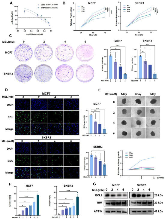 Melatonin inhibits cell proliferation. (A) MCF7 and SKBR3 cell lines were exposed to a series of melatonin concentrations (0, 1, 2, 4, 6, and 8 mM) for a duration of 24 h. Subsequently, cell viability was assessed utilizing the CCK8 assay. The half-maximal inhibitory concentration (IC50) values were determined through analysis with GraphPad Prism software. (B) The viability of MCF7 and SKBR3 cells exposed to varying concentrations of melatonin (0, 2, 4, and 6 mM) for 72 h was assessed at designated time points using the CCK8 assay. (C) The proliferative potential of MCF7 and SKBR3 cells exposed to varying concentrations of melatonin (0, 2, 4, and 6 mM) was evaluated through a colony formation assay. (D) The proliferative capacity of cells under various treatment conditions was evaluated using EdU (5-ethynyl-2′-deoxyuridine) incorporation assays. (E) Micrograph of multicellular tumor spheroid generated from SKBR3 after treatment with 0, 2, 4, or 6 mM melatonin. (F) Statistical analysis of apoptotic cells of MCF7 cells and SKBR3 cells under 24 h melatonin treatment (n = 3). (G) Western blot analysis of apoptosis-associated proteins in BC cells following 24 h of melatonin treatment. * p < 0.05, ** p < 0.01, *** p < 0.001, **** p < 0.0001.