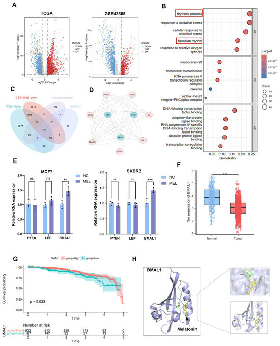 In this study, a differential analysis was conducted on two microarray datasets (TCGA and GSE42568), and subsequently, a volcano plot was generated to visually present the differentially expressed genes (Figure 2A). Gene Ontology (GO) enrichment analysis of differentially expressed genes (DEGs) identified significant associations with biological processes (BP), cellular components (CC), and molecular functions (MF). The top 5 GO items were listed (Figure 2B). The results revealed that the rhythmic process, the circadian rhythm, was significantly altered. Notably, the enrichment of circadian rhythm-related processes suggests that dysregulation of circadian genes may contribute to BC proliferation. An intersection analysis was conducted on the results derived from the four datasets, yielding ten common key feature genes (Figure 2C). These ten identified genes were subsequently submitted to the STRING database to construct a protein–protein interaction (PPI) network (Figure 2D). We observed that three genes were situated within the network’s core region and exhibited a higher number of connecting edges, suggesting they may perform key regulatory functions within the melatonin action mechanism. To further elucidate the expression patterns of these key genes, RNA was extracted from BC cells treated with 2 mM melatonin for 24 h, followed by quantitative real-time reverse transcription PCR analysis. Results revealed a significant upregulation trend in BMAL1 gene expression compared to control cells (Figure 2E). Then, we explored the expression status of BMAL1 in BC samples and found that BMAL1 was significantly down-regulated in BC tissues compared with normal breast tissues (Figure 2F). The survival analysis indicated that patients exhibiting reduced BMAL1 expression levels are associated with decreased overall survival durations (Figure 2G). Molecular docking analysis revealed that BMAL1 and melatonin could form a stable binding conformation (Figure 2H), with a binding energy of −5.193 kcal/mol. These results collectively suggest the possibility of direct binding between the two, but this conclusion requires further experimental verification. Data analysis and experimental verification show that BMAL1, as a key circadian rhythm-related gene, is down-regulated in breast cancer and is associated with poor prognosis. BMAL1 may be an important mediating mechanism of melatonin regulating breast cancer.