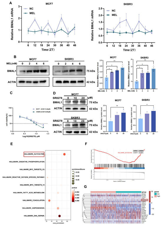 Melatonin regulates BMAL1 to affect glycolysis via ALDH3A1 in BC cells. (A) mRNA expression of BMAL1 in MCF7 and SKBR3 cells at the indicated times. Each point represents mean ± SEM values of three independent assays (n = 3). (B) Western blot assay of BMAL1 protein alteration after 24 h melatonin (0, 2, 4, 6 mM) treatment in BC cells. (C) IC50 value of 24 h SR8278 treatment on BC cells. (D) Western blot assay of BMAL1 protein alteration after 24 h SR8278 (0, 10, 20 μM) treatment in BC cells. (E,F) This dot plot visualizes gene set enrichment analysis (GSEA) results for hallmark gene sets. (G) Heat map of DEGs. Differentially expressed genes (DEGs) were identified in the integrated expression matrix by selecting p < 0.05 and |log fold change (FC)| > 1.0 as thresholds. * p < 0.05, ** p < 0.01.