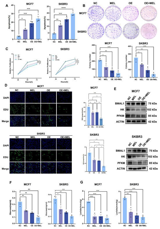 Given that BMAL1 may represent a downstream target of melatonin, this study further investigated the regulatory effects of BMAL1 overexpression on the biological behaviour of breast cancer cells. Following construction of a BMAL1 overexpression plasmid and its transfection into BC cells, apoptosis levels were assessed via flow cytometry. Results demonstrated a significantly elevated apoptosis rate in the BMAL1 overexpression group compared to the empty vector control group (Figure 4A). Colony formation assessment, CCK-8, and EdU assays showed a significantly lower clonogenicity, cell viability, and proportions of proliferating cells in MCF7 and SKBR3 cells with BMAL1 overexpression (Figure 4B–D). Additionally, expression of glycolysis-related genes was decreased at the protein level, and the decrease was more pronounced when melatonin was co-administered (Figure 4E). Prior research indicates that BMAL1 may modulate the proliferative potential of breast cancer cells through the regulation of glycolytic processes. To investigate the involvement of glycolytic dysregulation in breast cancer progression, this study evaluated two critical metabolites within the glycolytic pathway: glucose uptake and lactate production. The findings revealed that, consistent with expectations, overexpression of BMAL1 markedly decreased both the glucose uptake capacity (Figure 4F) and lactate production (Figure 4G) in breast cancer cells. In summary, overexpression of BMAL1 exerts an inhibitory effect on breast cancer cells by promoting apoptosis, suppressing proliferation, and downregulating glycolysis-related pathways. The inhibitory effects of BMAL1 overexpression were potentiated by co-treatment with melatonin, indicating that melatonin’s anti-tumor effects are consistent with and may amplify the BMAL1-mediated suppression of glycolysis and proliferation.