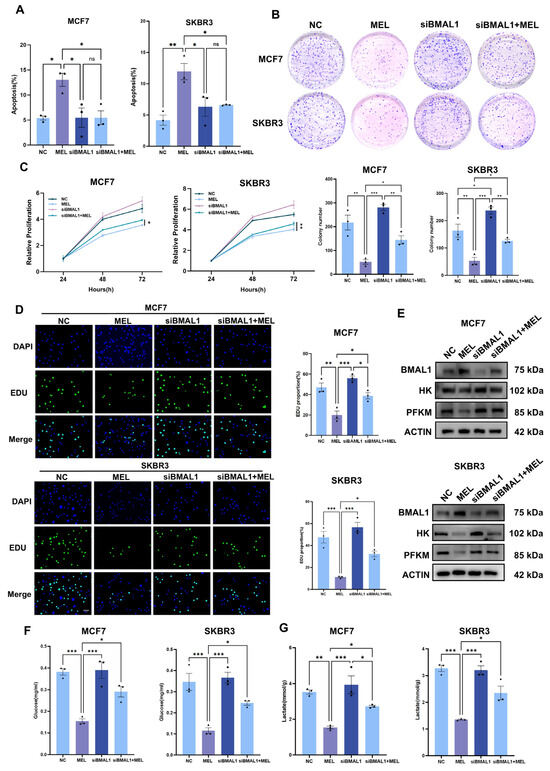Silencing of BMAL1 partially rescues melatonin-mediated attenuation of BC cell proliferation and aerobic glycolysis. (A) Apoptosis assay. (B) Colony formation. (C) CCK8 assay. (D) EDU assay. (E) MCF7 and SKBR3 cells with BMAL1 Silencing, after which the protein levels were determined by Western blot. (F) Glucose uptake. (G) Lactate production. ns, not significant, * p < 0.05, ** p < 0.01, *** p < 0.001.