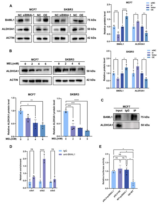 BMAL1 transcriptionally inhibits ALDH3A1 expression in BC cells. (A) Western blot analyses were conducted to evaluate the expression levels of BMAL1 and ALDH3A1 in MCF7 and SKBR3 cell lines following designated treatments (B) Western blot results of ALDH3A1 protein alteration with 24 h melatonin treatment. (C) To detect the interaction between the specified protein and BMAL1, lysates from breast cancer cells expressing this protein were subjected to immunoprecipitation using anti-BMAL1 antibody and IgG isotype control antibody. Following processing, the immunoprecipitates were analysed by Western blot using the designated antibody. (D) Using ChIP-qPCR technology, the enrichment levels of potential BMAL1 binding sites on the ALDH3A1 promoter were detected. (E) Relative luciferase activity driven by the ALDH3A1 promoter was measured in Hela cell lines following designated treatments. ns, not significant, * p < 0.05, ** p < 0.01, *** p < 0.001, **** p < 0.0001.