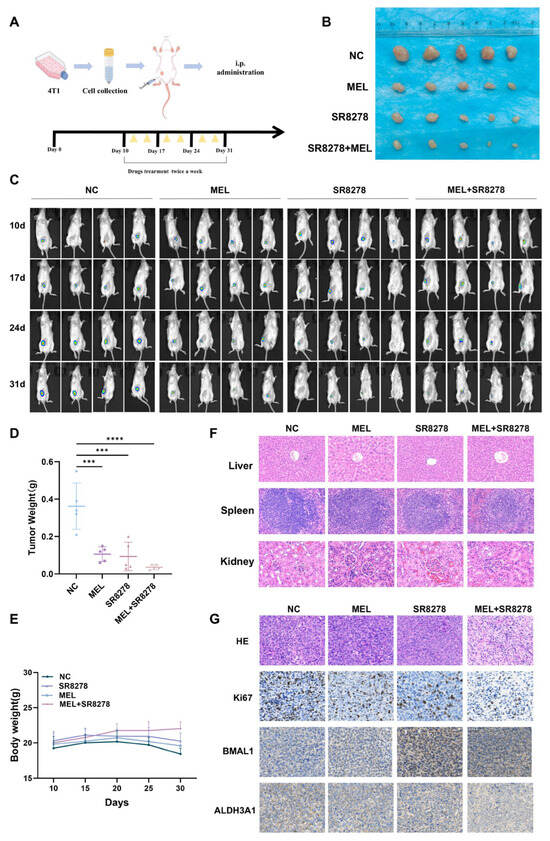 Subsequently, animal models were established to examine the effects of melatonin and SR8278 on the tumorigenesis of 4T1 cells in vivo (Figure 7A). The findings demonstrated that treatment with either melatonin or SR8278 significantly inhibited tumor growth, with their combined administration resulting in a further reduction in tumor size (Figure 7B–D). No significant differences in body weight were observed among the experimental groups (Figure 7E). Consistent with expectations, assessments revealed no evidence of nephrotoxicity, hepatotoxicity, or splenic toxicity across all four groups, suggesting that melatonin and SR8278 do not induce severe toxicity or adverse effects on these organs (Figure 7F). Furthermore, immunohistochemical analysis indicated that the combined treatment with SR8278 and melatonin markedly upregulated BMAL1 expression while concurrently suppressing the expression of Ki67 and ALDH3A1 (Figure 7G).