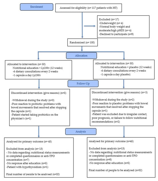 The following inclusion criteria were employed: (1) a diagnosis of Hashimoto’s thyroiditis based on the presence of anti-TPO and anti-TG antibodies, or characteristic ultrasound images indicative of HT; (2) thyroid function assessed for euthyroidism based on the results of tests performed by the patient; (3) female gender; (4) age between 18 and 64 years; (5) normal body weight (BMI 18.50–24.99 kg/m2) or excessive body weight (BMI ≥ 25.00 kg/m2); and/or a low-quality diet (low pHDI-10) []; (6) informed consent to participate in the study. The following criteria were used to determine exclusion from the study: (1) thyroid diseases other than HT, cancer, coeliac disease, Dühring’s disease or gluten allergy; (2) pregnancy, lactation; (3) administration of Lp299v or weight loss medications.