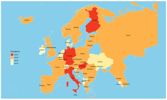 The prevalence of clustered unhealthy behaviours was 75.8% for two or more behaviours, 51.5% for three or more, and 16.3% for four or more (Figure S3). The prevalence of three or more unhealthy behaviours varies widely across countries, with relatively higher prevalences observed in Finland, Germany, Hungary, and Italy, while the lowest were observed in Ireland, Albania, and Armenia (Figure 2, Table S5).