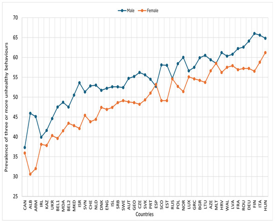 Prevalence of three or more unhealthy lifestyle behaviours by gender and country, HBSC 2018. Footnotes: ALB: Albania; ARM: Armenia; AUT: Austria; AZE: Azerbaijan; BEL1: Belgium (Flemish); BEL2: Belgium (French); BGR: Bulgaria; CAN: Canada; HRV: Croatia; CZE: Czech Republic; DNK: Denmark; ENG: England; EST: Estonia; FIN: Finland; FRA: France; GEO: Georgia; DEU: Germany; GRC: Greece; HUN: Hungary; ISL: Iceland; IRL: Ireland; ISR: Israel; ITA: Italy; KAZ: Kazakhstan; LVA: Latvia; LTU: Lithuania; LUX: Luxembourg; MKD: Macedonia; MLT: Malta; NLD: Netherlands; NOR: Norway; POL: Poland; PRT: Portugal; MDA: Republic of Moldova; ROU: Romania; RUS: Russia; SCO: Scotland; SRB: Serbia; SVK: Slovakia; SVN: Slovenia; ESP: Spain; SWE: Sweden; CHE: Switzerland; UKR: Ukraine; WAL: Wales.