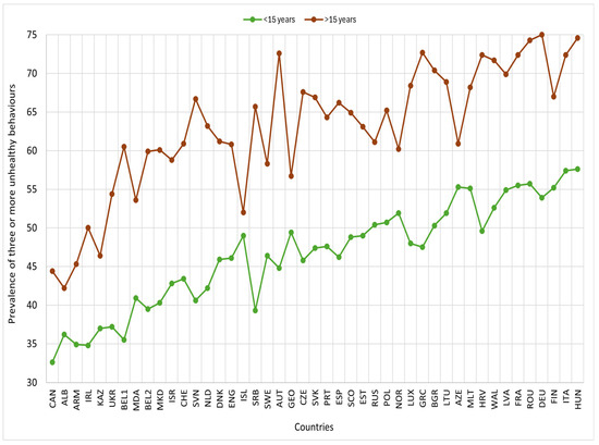 Prevalence of three or more unhealthy lifestyle behaviours by age category and country, HBSC 2018. Footnotes: ALB: Albania; ARM: Armenia; AUT: Austria; AZE: Azerbaijan; BEL1: Belgium (Flemish); BEL2: Belgium (French); BGR: Bulgaria; CAN: Canada; HRV: Croatia; CZE: Czech Republic; DNK: Denmark; ENG: England; EST: Estonia; FIN: Finland; FRA: France; GEO: Georgia; DEU: Germany; GRC: Greece; HUN: Hungary; ISL: Iceland; IRL: Ireland; ISR: Israel; ITA: Italy; KAZ: Kazakhstan; LVA: Latvia; LTU: Lithuania; LUX: Luxembourg; MKD: Macedonia; MLT: Malta; NLD: Netherlands; NOR: Norway; POL: Poland; PRT: Portugal; MDA: Republic of Moldova; ROU: Romania; RUS: Russia; SCO: Scotland; SRB: Serbia; SVK: Slovakia; SVN: Slovenia; ESP: Spain; SWE: Sweden; CHE: Switzerland; UKR: Ukraine; WAL: Wales.