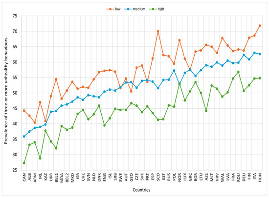 In most countries, the prevalence of three or more unhealthy behaviours was higher among males than females. Similarly, the prevalences were higher among 15-year-olds and older compared to those under 15, and lower among adolescents with high or medium family affluence than those with low family affluence (Figure 3, Figure 4 and Figure 5).