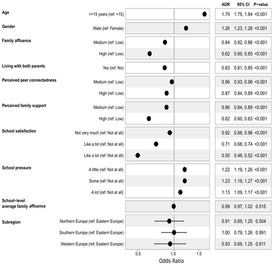 Eight individual/family level variables (age, sex, family affluence, living with parents, perceived family support, perceived peer support, school satisfaction, and school pressure), one aggregated school-level variable (average school-level family affluence), and one country-level variable (the geographical area of the study) were included in the analysis (Table S1).
