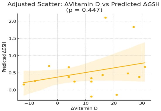 In multivariable linear regression models adjusted for age, weight, body fat percentage, and baseline 25(OH)D (Table 3), Δ25(OH)D did not emerge as an independent predictor of ΔTAC, ΔGSH, or ΔTBARS (Figure 2). For ΔGSH, none of the included predictors reached statistical significance. For ΔTAC, no variables were significantly associated with changes in antioxidant capacity. In contrast, for ΔTBARS, both weight (β = 0.08, p = 0.011) and body fat percentage (β = −0.13, p = 0.014) were independently associated with reductions in lipid peroxidation.