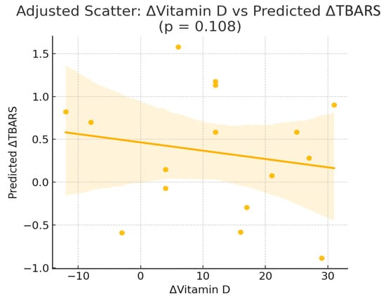 The observed small reduction in TBARS was not directly associated with serum vitamin D changes. Instead, it appeared to be more strongly related to alterations in body weight and fat mass, in line with previous studies reporting that improvements in TBARS are often linked to changes in body composition rather than micronutrient supplementation per se. The small decline in TBARS likely reflects concurrent improvements in body composition rather than a direct antioxidative action of vitamin D itself. Thus, our findings suggest that vitamin D might have only an indirect role, possibly mediated through effects on adiposity.
