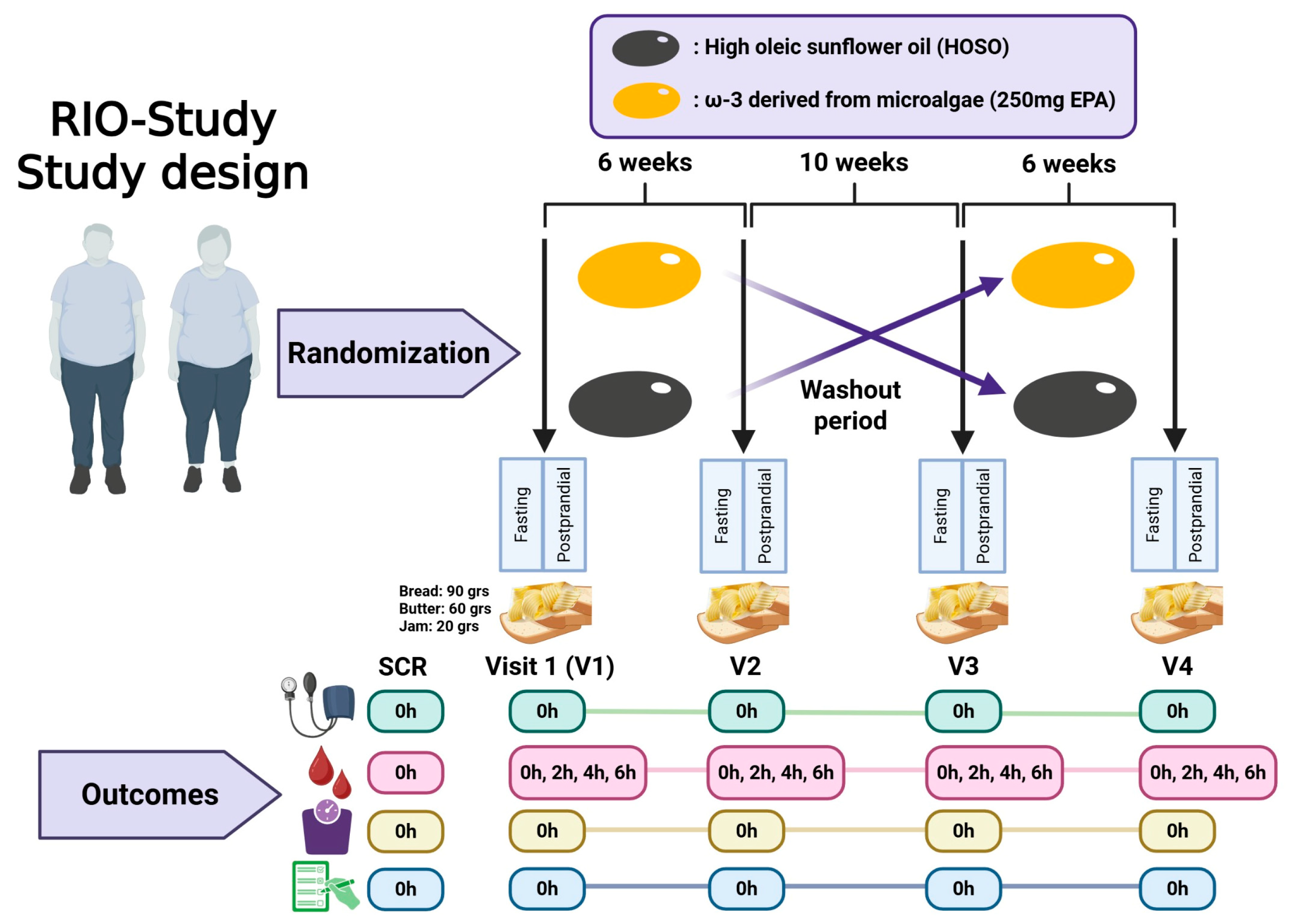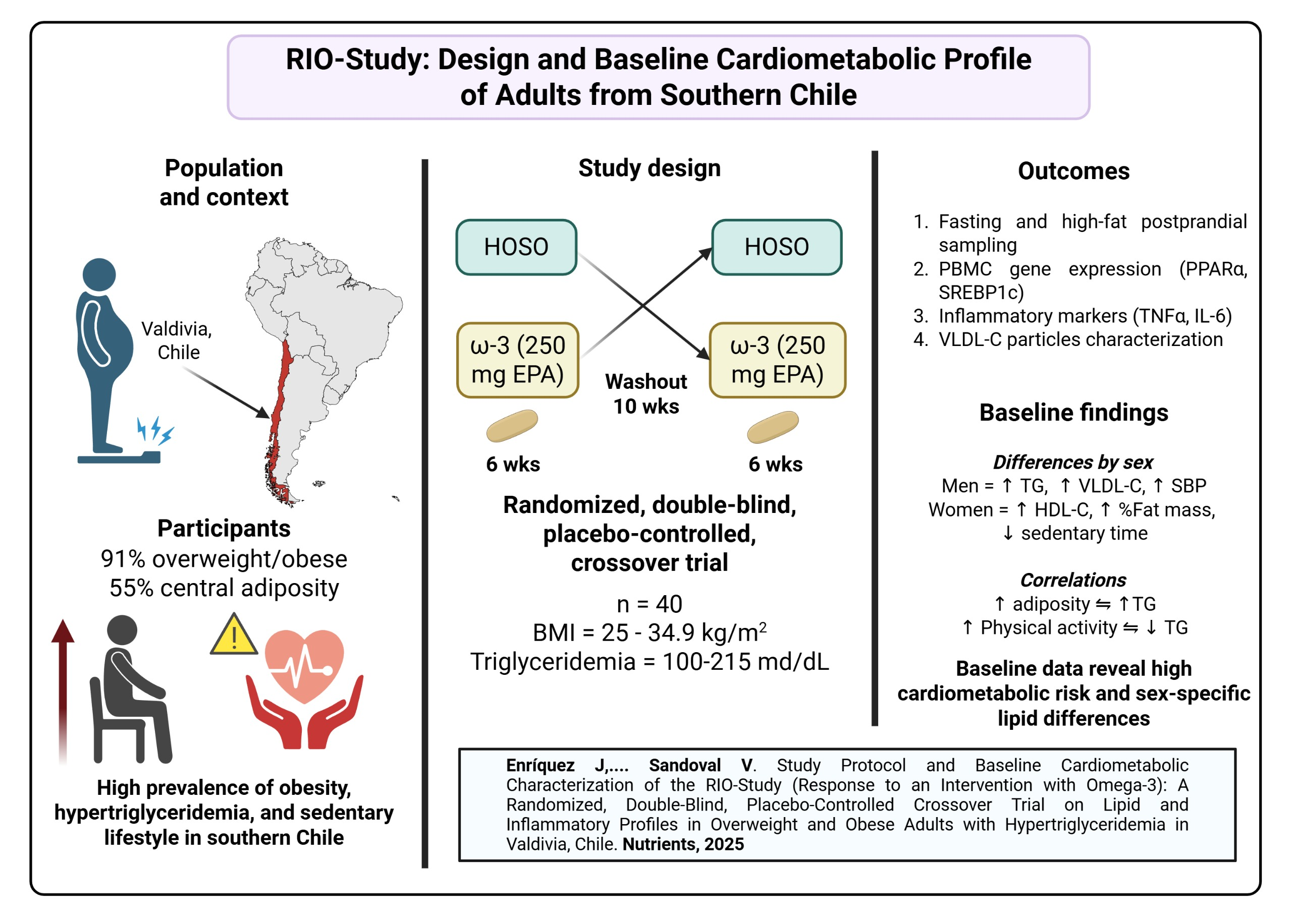 Enríquez J, Quezada C, Molina J, Sáez M, Mitre I, Moreira C, Sandoval F, Maldonado R, Fitó M, Zagmutt S, et al. Study Protocol and Baseline Cardiometabolic Characterization of the RIO-Study (Response to an Intervention with Omega-3): A Randomized, Double-Blind, Placebo-Controlled Crossover Trial on Lipid and Inflammatory Profiles in Overweight and Obese Adults with Hypertriglyceridemia in Valdivia, Chile. Nutrients. 2025; 17(21):3397. https://doi.org/10.3390/nu17213397
