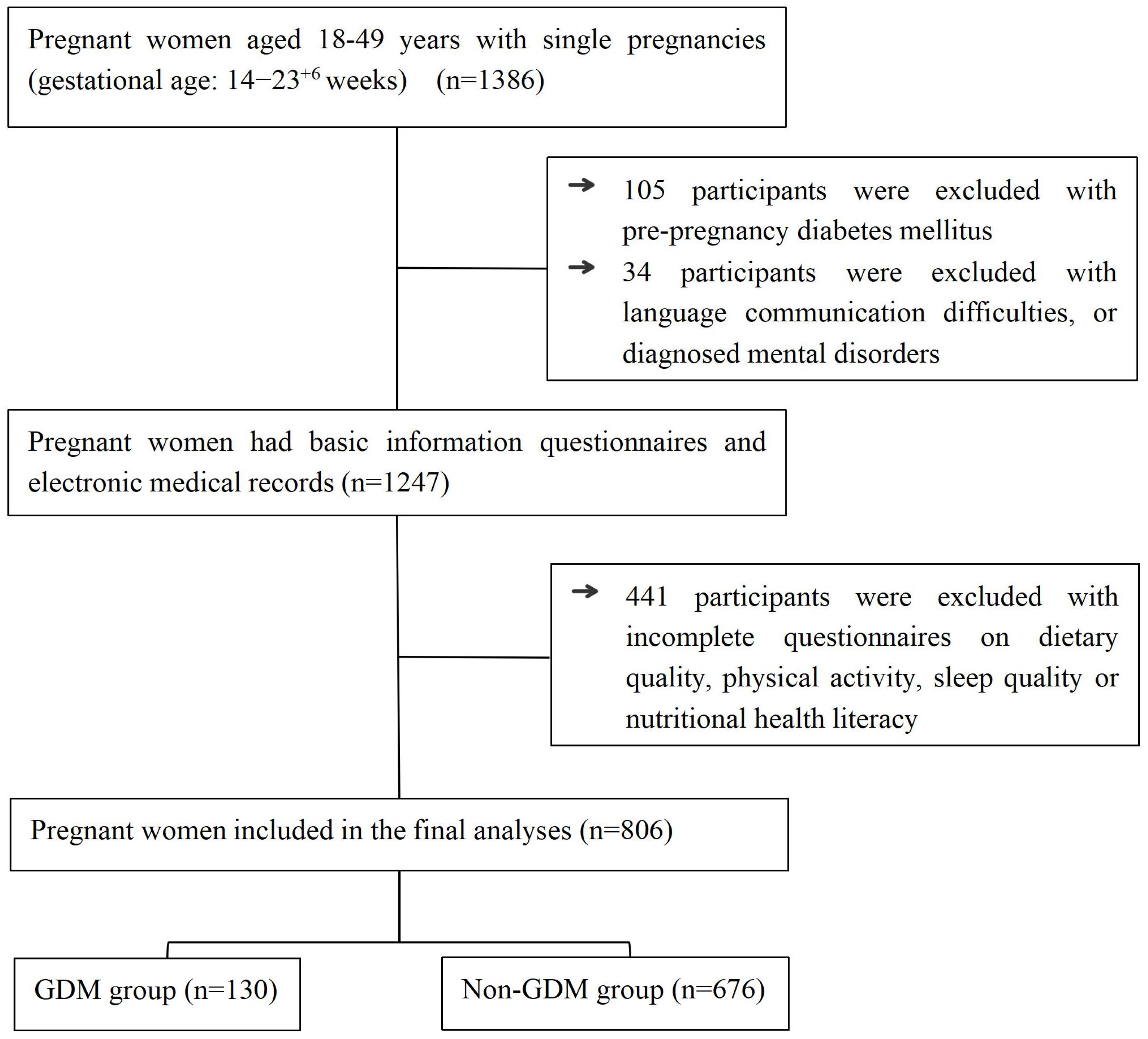 - Lai, Y.; Wang, C.; Ouyang, J.; Wu, L.; Wang, Y.; Wu, P.; Ye, Y.X.; Yang, X.; Gao, Y.; Wang, Y.X.; et al. Association between nighttime sleep duration, midday napping, and sleep quality during early pregnancy and risk of gestational diabetes mellitus: A prospective cohort study in China. Sleep Med. 2024, 119, 164–171. [Google Scholar] [CrossRef] [PubMed]