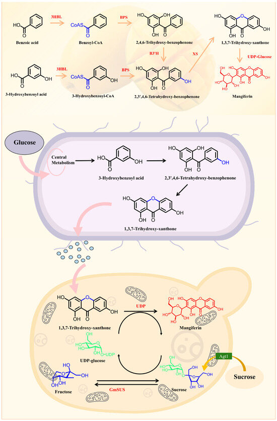 MF, a bioactive xanthonoid with antioxidant and anti-inflammatory properties, is biosynthesized through the integration of phenylpropanoid and polyketide pathways. Starting from phenylalanine, phenylalanine ammonia-lyase generates p-coumaric acid, which is converted to benzoyl-CoA. A type III polyketide synthase then extends the polyketide chain using malonyl-CoA, followed by cyclization and oxidation via cytochrome P450 enzymes to form the xanthone core. Subsequent hydroxylation and methylation modify the skeleton, while a UDP-glycosyltransferase attaches glucose to the C-2 hydroxyl group to complete glycosylation. The synthesis is regulated by developmental stages, environmental stresses, and jasmonic acid signaling. Heterologous expression of key enzymes enables metabolic engineering for production, though challenges remain in pathway elucidation, enzyme activity optimization, and intermediate toxicity. Deciphering these mechanisms holds promise for natural drug development and synthetic biology applications [44,46] (Figure 3).