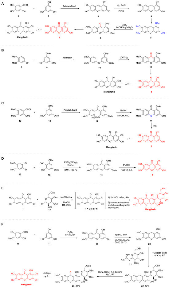 Total synthetic route of Mangiferin. (A,B): The Tanase research group conducted a study on the synthesis of tetrahydroxyxanthone (1941). (C): The Scheinmann research group reported the synthesis of tetrahydroxyxanthone (1973). (D): The Yang group developed an efficient synthesis of tetrahydroxyxanthone (2014). (E): The research team of Nott and Roberts achieved the synthesis of MF (1967). (F): The Yu group devised an efficient synthetic route to MF (2010).