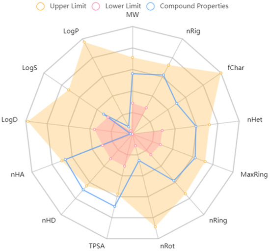 Radar chart involved in ADMET properties of mangiferin and relevant metabolites compared with the thresholds. Het, heteroatoms; fChar, formal charge; Rot, rotatable bonds; HD, hydrogen bond donors; MaxRing, atoms in the biggest ring; TPSA, topological polar surface area; LogS, solubility.