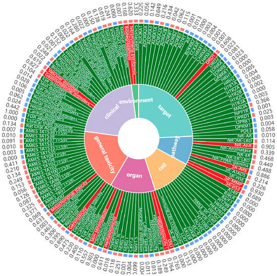 Complementing the experimental findings, in silico predictions provide a theoretical perspective on MF’s ADME properties. The ADME process of MF was predicted by the ADMETLab 3.0 platform and Deep ToxLab platform (Figure 7). According to the ADME prediction results, MF exhibits poor oral absorption (low bioavailability), difficulty in penetrating cell membranes and the blood–brain barrier, and limited distribution in the body due to its large molecular weight (approximately 422 g/mol), strong hydrophilicity (extremely low LogP/LogD), high polar surface area, and abundant hydroxyl groups (multiple hydrogen bond donors). Additionally, its polyphenolic hydroxyl structure is prone to phase II metabolism, leading to rapid metabolism and primarily excretion via the kidneys and bile, which aligns with the extensive conjugation observed experimentally.
