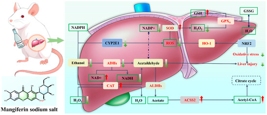 - Li, Z.J.; Pu, Z.J.; Gao, Y.W.; Zhou, M.; Zhang, Z.; Xiao, P.F.; Chen, J.T.; Zhou, C.Y. Integrated serum and liver metabolomics decipher the hepatoprotective mechanisms of mangiferin sodium salt through modulating alcohol metabolism on alcoholic liver disease. Food Biosci. 2024, 61, 104631. [Google Scholar] [CrossRef]