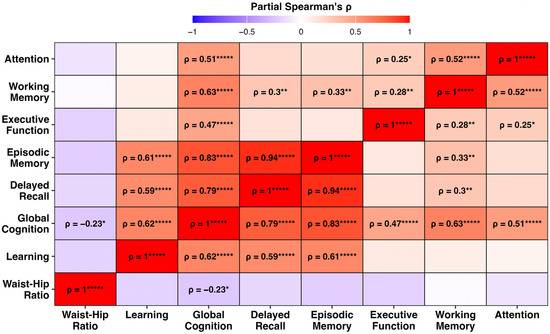 Heatmap of partial Spearman correlation coefficients (ρ) among waist–hip ratio (WHR) and seven cognitive domains, controlling for age, sex, and APOE ε4 carrier status. Warmer colours indicate stronger positive correlations, and cooler colours indicate negative associations. Only correlations that survived false discovery rate (FDR) correction are labelled (FDR p < 0.05). Asterisks denote significance levels: * p < 0.05, ** p < 0.01, and ***** p < 0.00001.