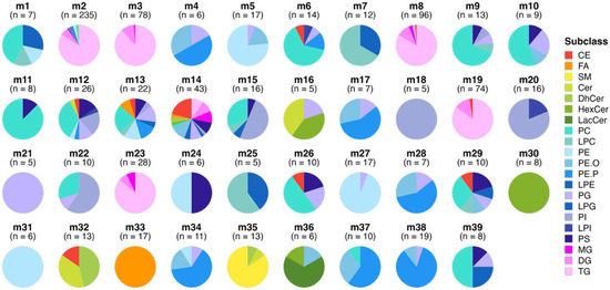 From the raw spectral data, 918 lipid features passed quality control and were selected for statistical analysis. Of these 918 lipid features, the WGCNA identified 39 modules of covarying lipids. One module (m14; 7% of all lipid features) contained all of the lipids that could not be clustered with any of the remaining 38 modules and thus was excluded from downstream analyses. The total numbers of lipids and subclass compositions of each module are highlighted in Figure 2, and the corresponding lipid features that comprise each module can be found in Supplementary Table S2 and Figure S3.