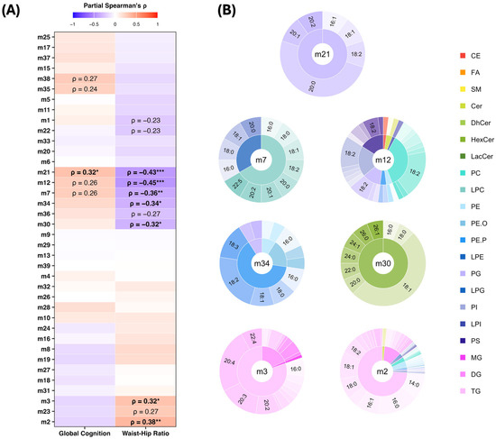 The partial Spearman correlation analysis revealed several modules that were associated with either the WHR or global cognition and one module that was associated with both. Module m21, enriched with phosphatidylglycerol (PG) lipids that carry a 20:0 (arachidic acid) fatty acyl side chain, was positively correlated with global cognition (ρ = 0.32, FDR p < 0.05) and negatively correlated with the WHR (ρ = −0.43, FDR p < 0.001). Modules m12—enriched with phospholipids, predominantly phosphatidylcholines (PCs), carrying an 18:2 fatty acyl side chain—and m7, enriched with lysophosphatidylcholines (LPCs), showed a similar pattern; however, only the negative associations with the WHR remained significant after the FDR correction. These positive associations with cognition and the negative association with the WHR may be indicative of a more favourable lipid profile, both cognitively and metabolically. Two additional modules also showed a metabolically favourable pattern, demonstrating significant negative associations with the WHR. These include modules m34 (ρ = −0.34, FDR p < 0.05), enriched with ether-linked phospholipids such as plasmenyl-phosphatidylethanolamine (PE-P) and plasmanyl-phosphatidylethanolamine (PE-O), and m30 (ρ = −0.32, FDR p < 0.05), which is enriched with hexosylceramide (HexCer) lipid species. In contrast, two modules that showed less favourable patterns, i.e., positive associations with the WHR, were both enriched in triacylglycerols (TGs), which included modules m3 (ρ = 0.32, FDR p < 0.05)—which comprised TG lipids carrying a 20:3 or 20:4 fatty acyl side chain—and m2 (ρ = 0.38, FDR p < 0.01), which predominately contained saturated fatty acyl-carrying TGs. The associations between the lipid modules, global cognition, and the WHR are highlighted in Figure 3A, while lipid features that comprise each significant module are displayed in Figure 3B.