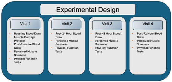 Experimental Design. During Visit 1, participants first underwent a baseline blood draw followed by the muscle damage protocol. Immediately after the protocol, a post-exercise blood sample was collected. Participants then completed assessments of perceived muscle soreness and physical function. During visits 2, 3, and 4 (24, 48, and 72 h post-EIMD, respectively), each session included a blood draw followed by assessments of perceived muscle soreness and physical function.
