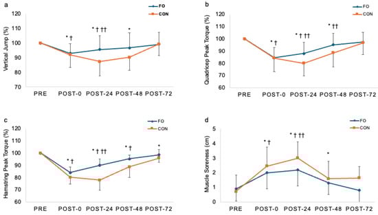 A significant group x time interaction was found for quadriceps peak torque (F = 11.119, p < 0.001). In the CON group, quadriceps peak torque was significantly reduced at post-0 h (p = 0.001), -24 h (p < 0.001), and -48 h (p = 0.007). The FO group also presented substantially reduced quadriceps peak torque at post-0 h (p < 0.001), -24 h (p = 0.001), and returned to the baseline levels at post-48 h. The FO group presented a significantly greater quadriceps peak torque than the CON group at post-24 h and -48 h (p < 0.001).