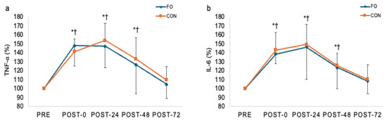 Changes (mean ± SD) in TNF-α (a) and IL-6 (b) at post-0, post-24, post-48, and post-72 h after eccentric contraction. FO: Fish oil; CON: placebo control. TNF-α = Tumor Necrosis Factor-Alpha; IL-6 = Interleukin-6. * p ≤ 0.05, difference from pre-exercise levels in CON; † p ≤ 0.05 difference from pre-exercise levels in FO.