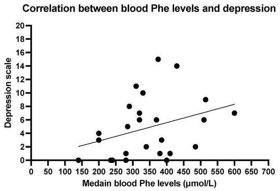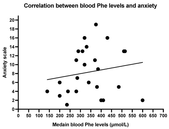 The Spearmen correlation between mean blood Phe levels and depression scale shows a weak correlation (r = 0.3713, p = 0.0677; Figure 2). No significant correlation was found between anxiety and mean blood Phe (r = 0.1942, p = 0.3523; Figure 3).