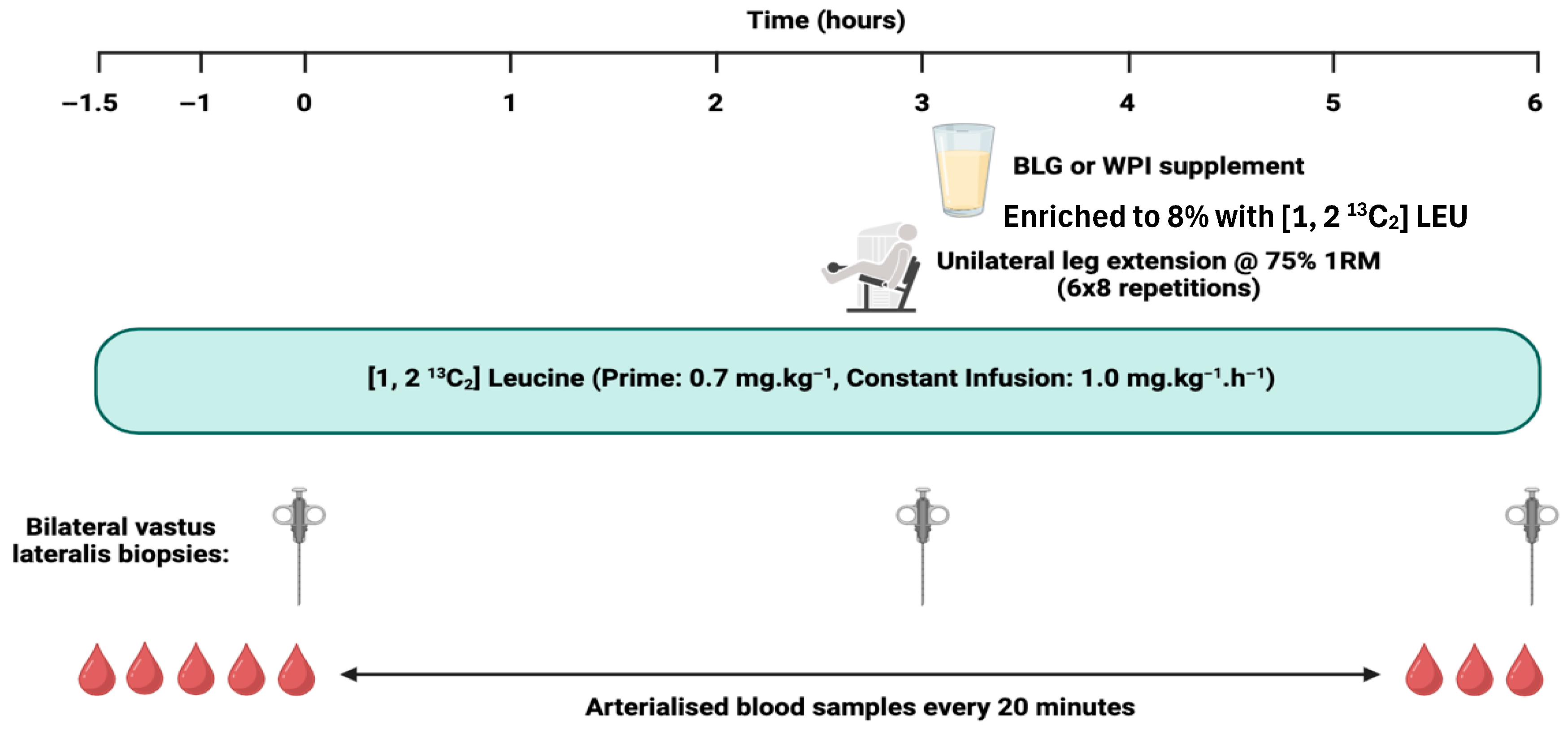 In conclusion, a “suboptimal” (20 g being suggested optimal) 10 g dose of BLG in young individuals leads to significant increases in plasma EAA, BCAA, and insulin concentrations with greater plasma leucinaemia achieved compared to WPI, in addition to significant stimulation of MPS in the FED and FED-EX states. In terms of limitations, we acknowledge the lack of assessment of the impact of BLG on LEU kinetics and muscle anabolism in females. Moreover, larger sample sizes and greater diversity in age and ethnicity are required. In addition, while taking a pragmatic approach in refinement of BLG and comparing to WPI, it is acknowledged these are not precisely balanced in non-LEU individual EAA content (despite being well-matched for total EAA), which could influence outcomes. Future work should also focus on dose–responses per unit body/muscle mass, clinical populations who may benefit from the superior LEU content due to anabolic resistance to protein nutrition/reduced ability to utilise large amounts of protein and amino acids, and the satiating effect of protein impacting their macronutrient intake.