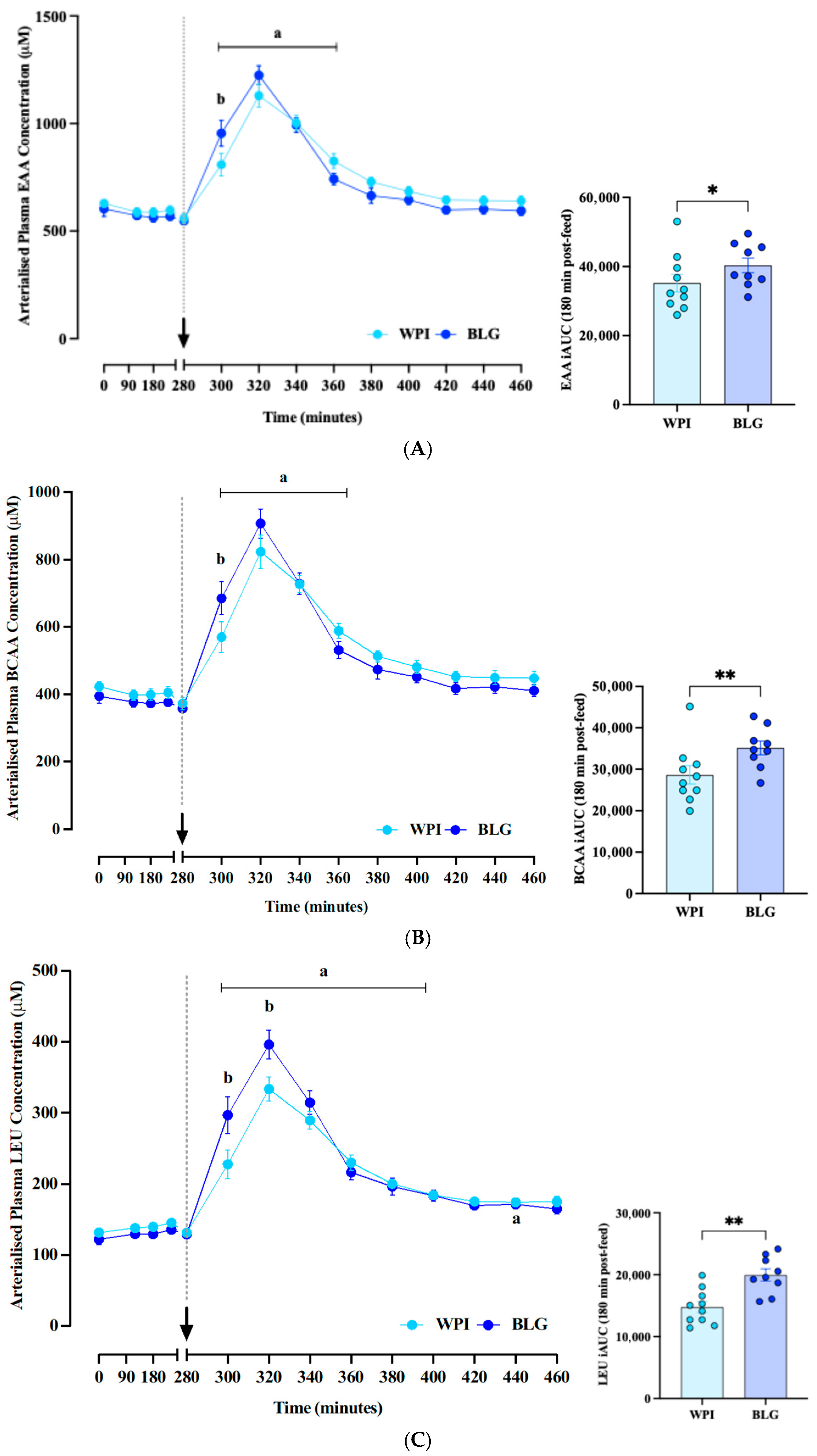 Figure 2. Effects of whey protein isolate (WPI; n = 10) and β-lactoglobulin (BLG; n = 9) on arterialised plasma essential amino acid (EAA, (A)); branched-chain amino acid (BCAA, (B)); and leucine (LEU, (C)) concentrations. The arrow and dotted line indicate the consumption of protein supplements. Data are presented as mean ± SEM. a: significant difference vs. basal (* p < 0.05; ** p < 0.01); b: significant difference between groups (p < 0.05).