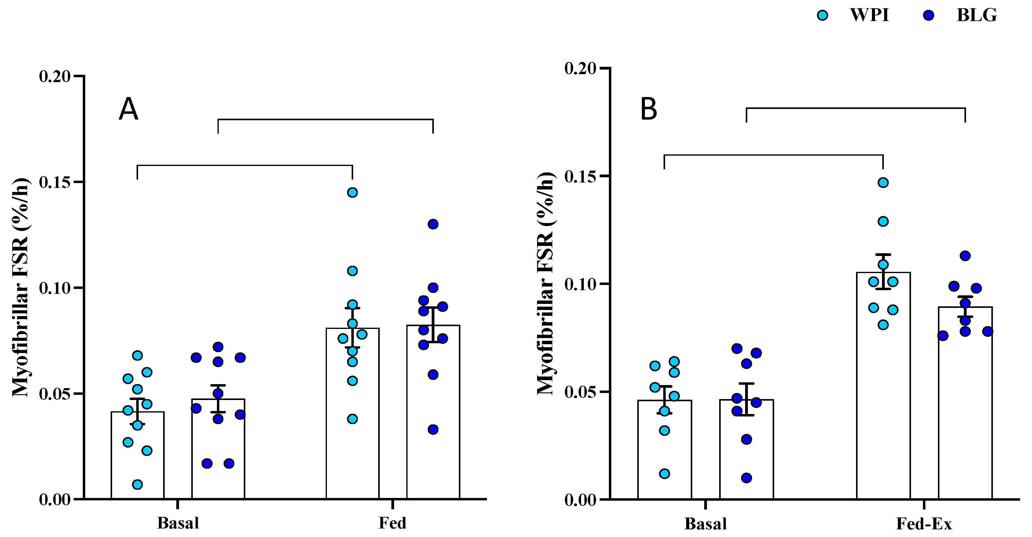 Figure 4. The effects of whey protein isolate (WPI) and β-lactoglobulin (BLG) on skeletal muscle myofibrillar fractional synthetic rate in response to feeding (FED; n = 10 (A) and feeding-plus-acute resistance exercise (FED-EX; n = 8); (B). Data presented as mean (bars) ± SEM, with individual data points overlaid.
