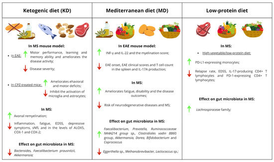 More recently, a 2025 study reported that a high-carbohydrate diet (75% carbohydrates for 6–7 weeks) was associated with an earlier onset of EAE, a higher disease incidence and with more severe clinical symptoms. Mice fed this diet displayed higher CNS immune cell infiltration and pronounced demyelination, indicating that excessive carbohydrate consumption acts as an aggravating factor in EAE pathogenesis [58].