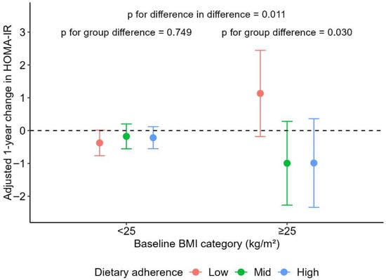 Adjusted one-year changes in HOMA-IR according to MDS tertile groups and baseline BMI category. Values represent model-estimated means ± 95% confidence intervals derived from linear mixed-effects models adjusted for age, sex, alcohol consumption, smoking status, physical activity, hypertension, T2DM, and dyslipidemia. p-values indicate between-group differences and group × BMI interaction effects.