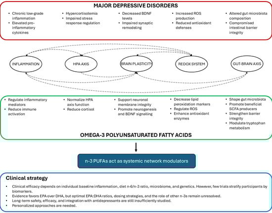Chicago/Turabian StyleDe Cillis, Floriana, Veronica Begni, Patrizia Genini, Daniele Leo, Marco Andrea Riva, and Annamaria Cattaneo. 2025. "Restoring Balance: The Role of Omega-3 Polyunsaturated Fatty Acids on the Gut–Brain Axis and Other Interconnected Biological Pathways to Improve Depression" Nutrients 17, no. 21: 3426. https://doi.org/10.3390/nu17213426