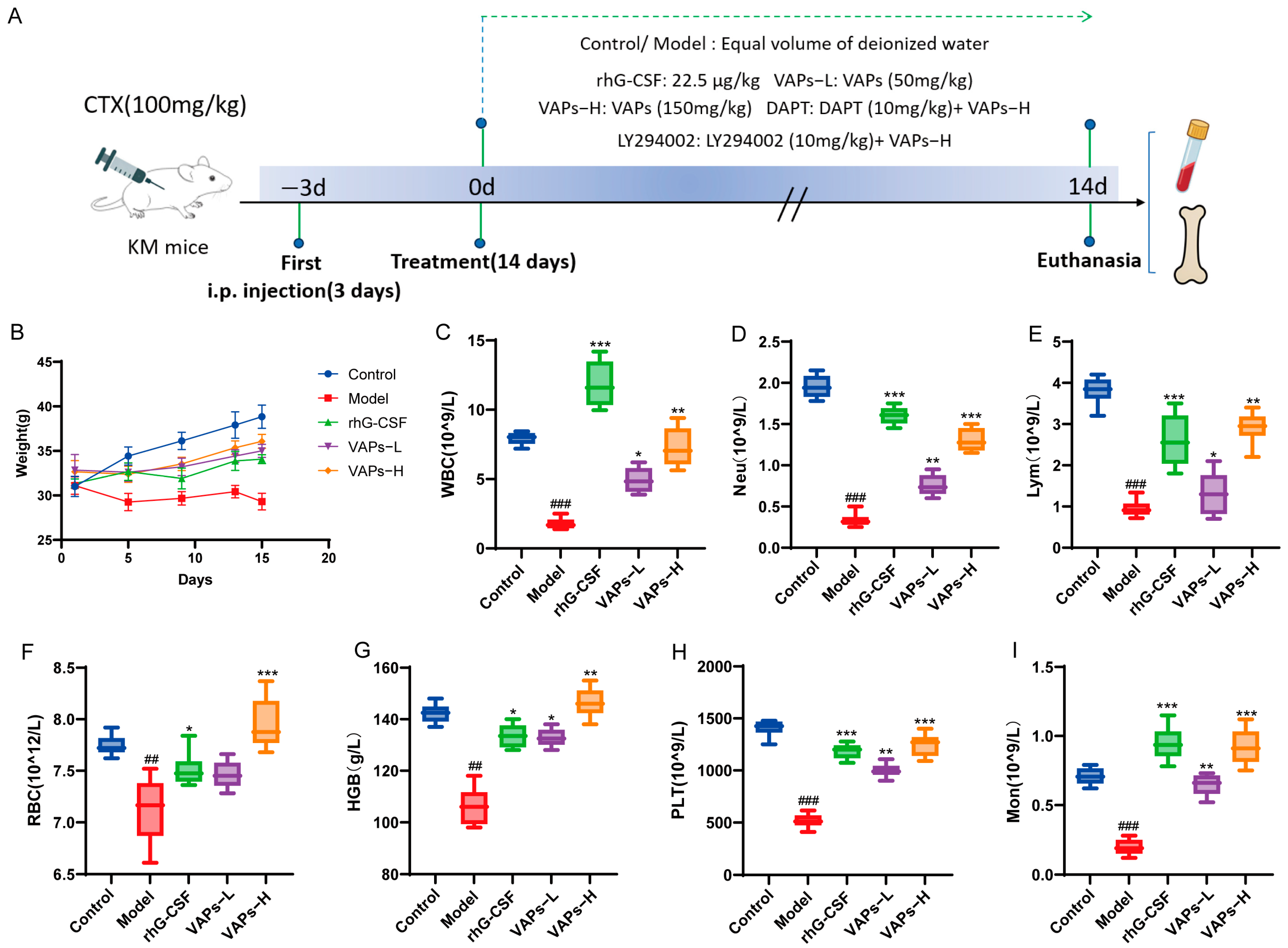 Chicago/Turabian StyleGao, Fusheng, Yusu Wang, Jinze Liu, Yichen Xie, Ying Geng, Zhongmei He, Jianan Geng, Jianming Li, Weijia Chen, and Rui Du. 2025. "Protective Effects of Velvet Antler Polypeptides on Cyclophosphamide-Induced Myelosuppression in Mouse and Bone Marrow Mesenchymal Stem Cells" Nutrients 17, no. 21: 3428. https://doi.org/10.3390/nu17213428