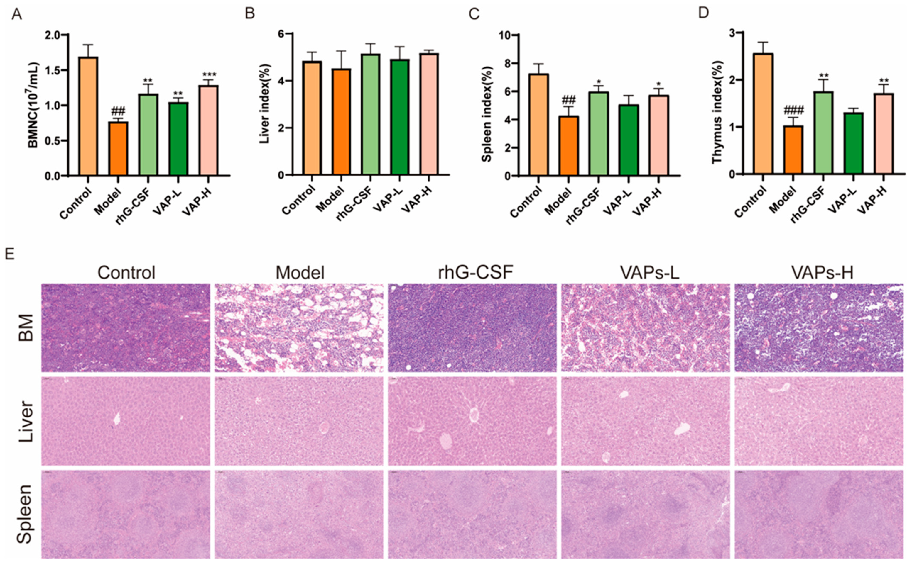 3.10. VAPs’ Effects on the Histopathological Morphology of the Femur, Spleen, and Liver Tissues in Myelosuppression Mice