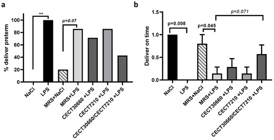 Combined treatment of two cell-free supernatants reduced the percentage of preterm deliveries (a) and increased the percentage of on-time deliveries (b). (a) Group NaCl showed 0% preterm deliveries, whereas LPS injection caused 100% PTB. The MRS + LPS, ORD + LPS, and CECT + LPS groups slightly reduced the % of preterm deliveries. However, the combination of both cell-free supernatants reduced the effect of LPS injection on preterm deliveries. (b) Representation of on-time term deliveries (value = 1) or premature deliveries (value = 0) of the same groups of animals. n = 10/group. ** p < 0.01.